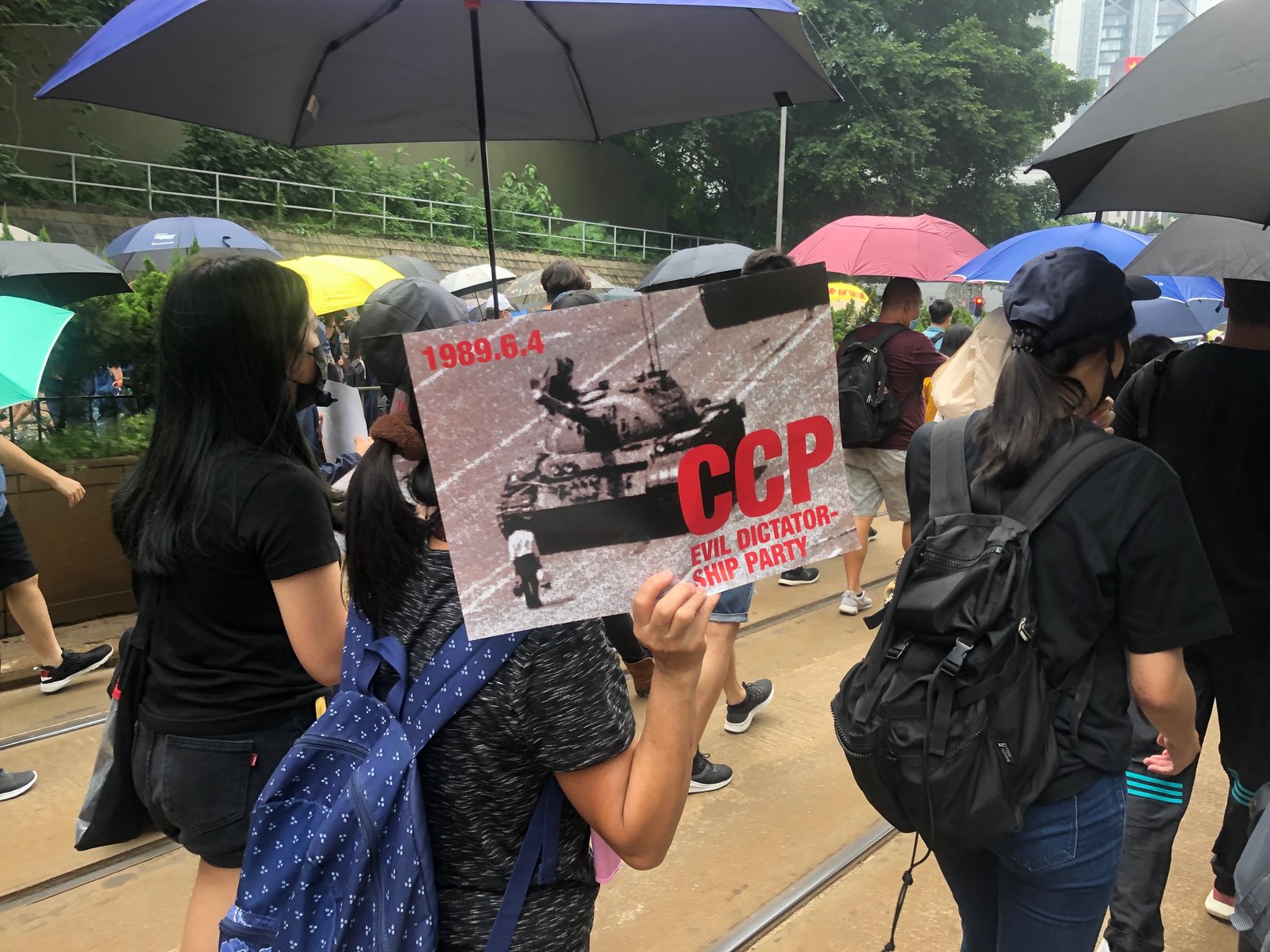 Somehow, watching young people and conversely observing police, I stumbled upon the march. Moments later I was handed a poster of Tankman from June 4, 1989, with the words: “CCP Evil Dictatorship Party.”